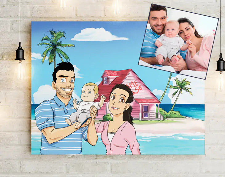 Choisissez le nombre de personnages (solo, duo, famille), sélectionnez votre décor (Kame House, Capsule Corp, planète Namek…) et envoyez-nous votre photo. Vous recevrez un aperçu sous 48 h et bénéficierez de retouches illimitées avant impression.